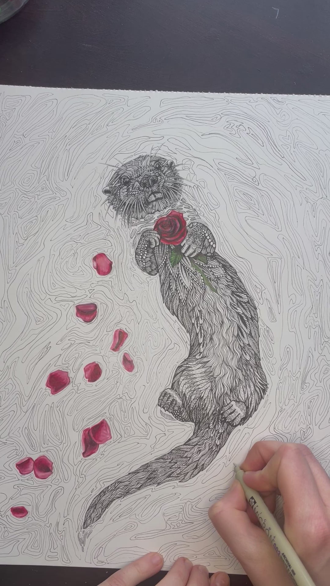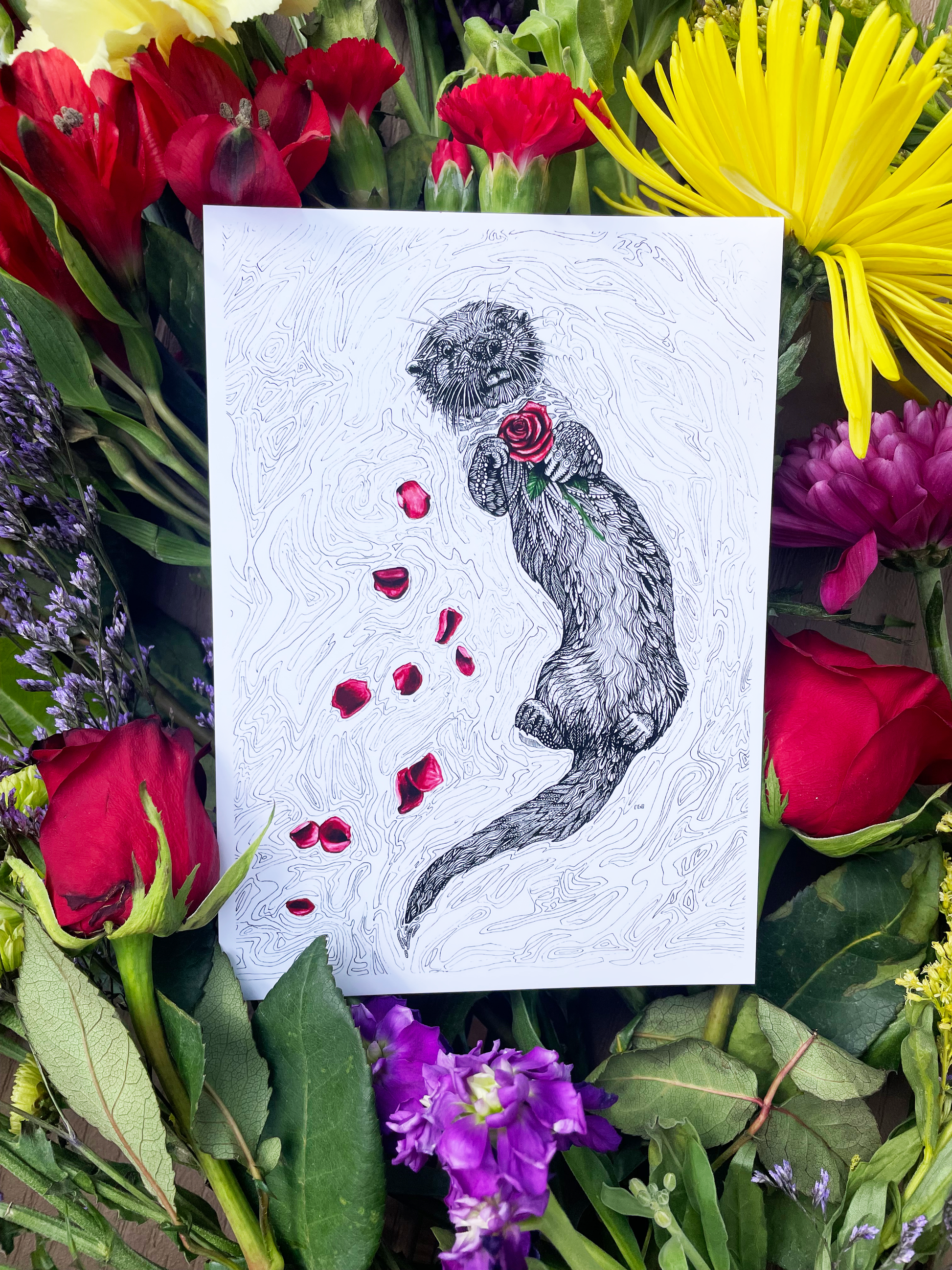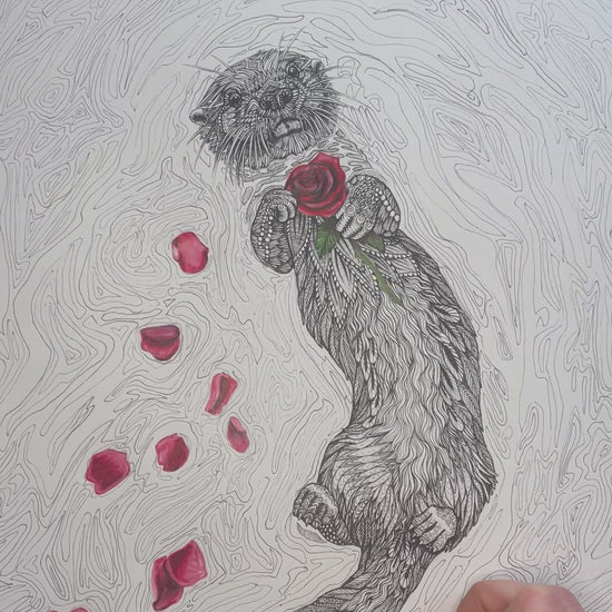 Otterly in Love or "Loves Me, Loves Me Not" – This charming pen and color pencil drawing captures a wistful otter floating on his back, delicately plucking rose petals as he ponders love’s eternal question. With intricate detail and a touch of whimsy, this piece blends nature and romance in a way that’s both heartwarming and bittersweet. Perfect for dreamers, romantics, and otter admirers alike.