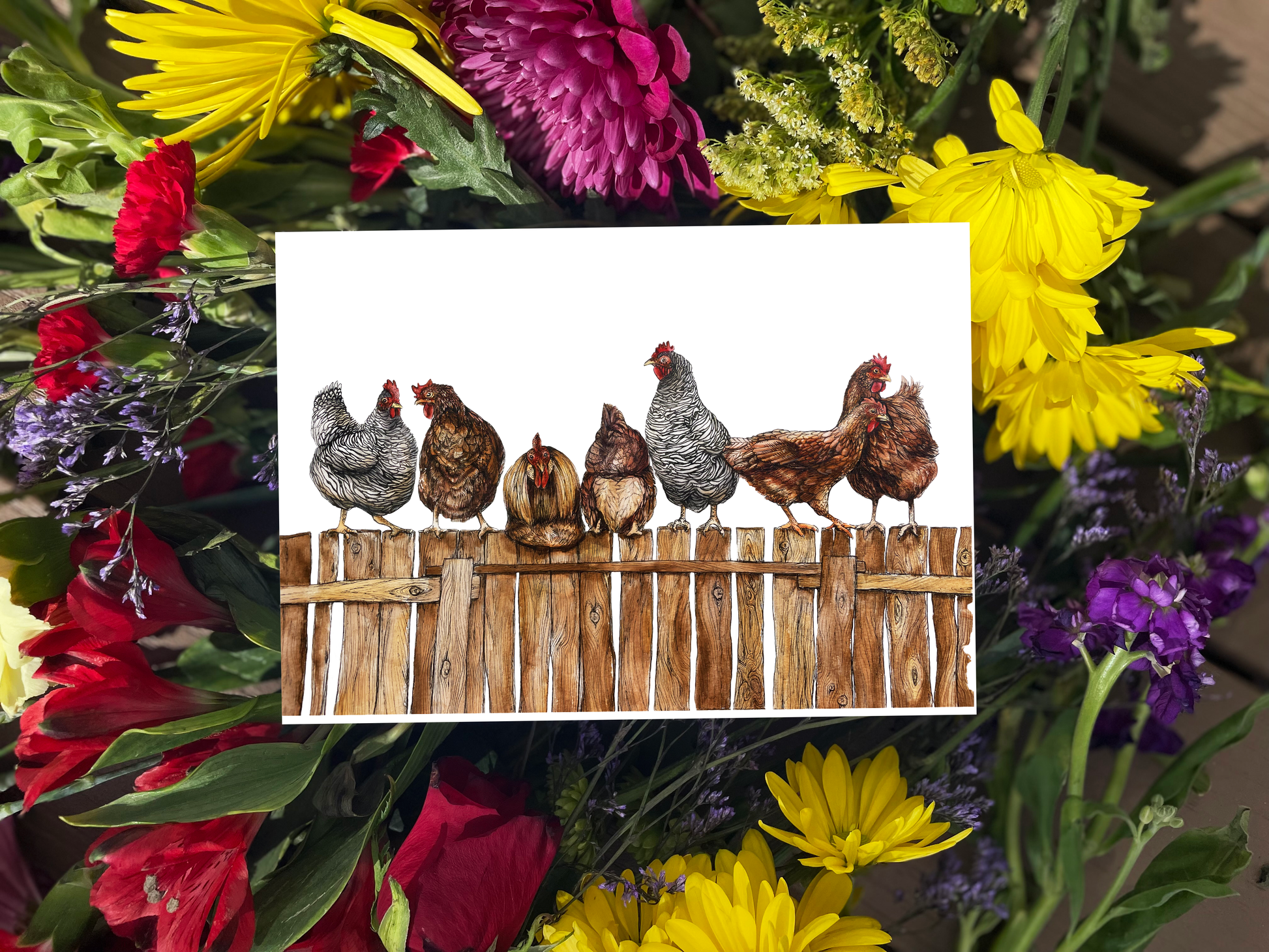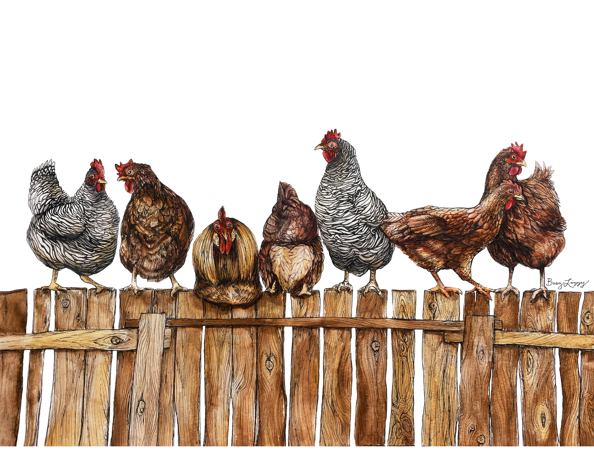 Chickens sitting on a wooden fence